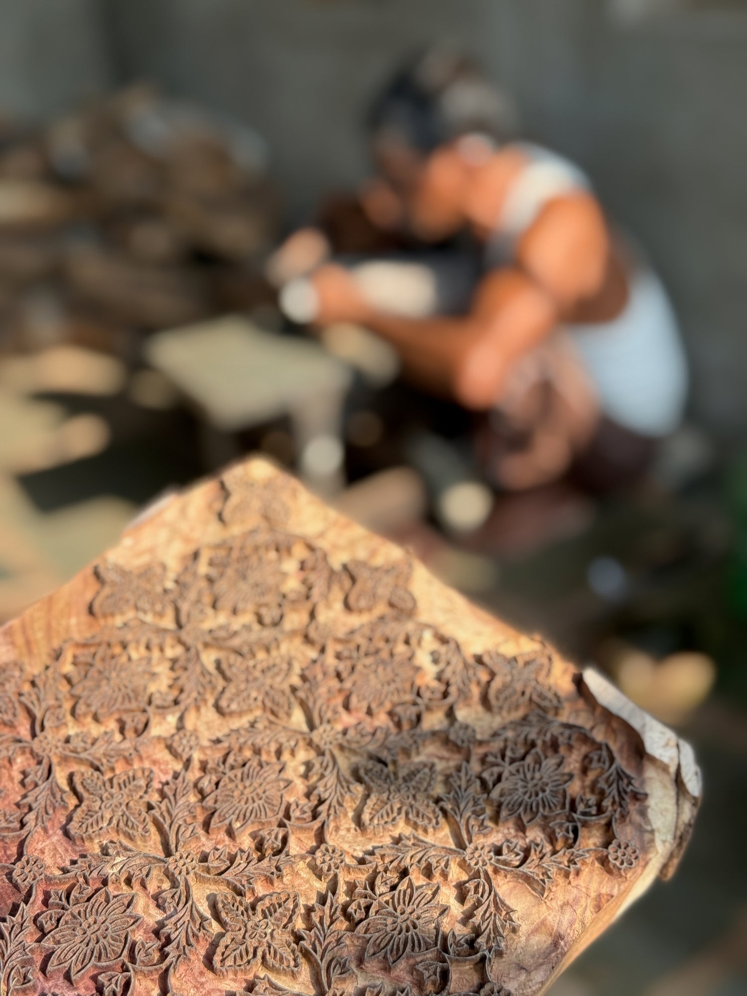 Each design begins long before the fabric is printed: with artisans carving wooden blocks by hand or preparing screens with care, setting the stage for patterns that carry history in every line.